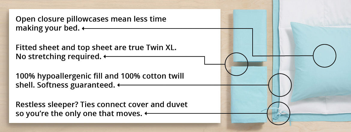 This dorm bedding package was designed just for you! Take your favorite, loved on pillow with you when you move out and don’t bother with a top sheet. The soft cotton twin XL bedding set for college is designed to fit your dorm bed perfectly and set the stage for your freshman dorm style.